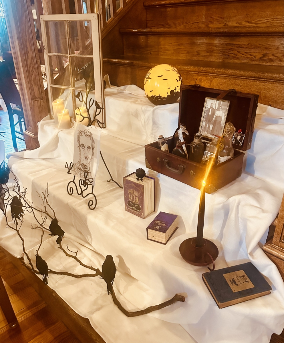 Literary vignettes were strewn about the steps and stage of the museum. Each table celebrated a famous POE work, such as “The Black Cat” and “The Premature Burial.” Ravens and gothic décor abounded.
