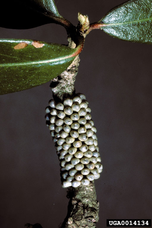 v Buck moth eggs wrapped around the twig of a live oak tree; the mourning cloak butterfly deposits its eggs similarly. Photo: Gerald J. Louisiana State University, Bugwood.org