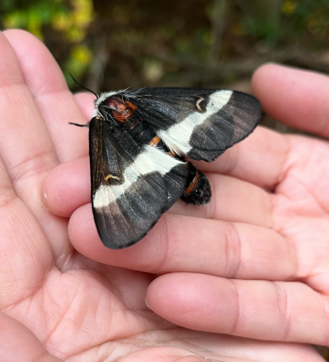 Female buck moth. Note the forewing’s black-bordered reniform (kidney-shaped) spot. Photo: J. Morton Galetto, taken October 25, 2025
