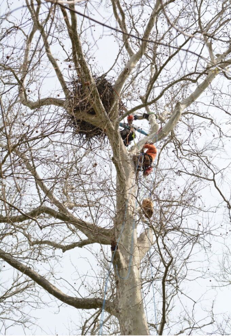 State biologists supervise the banding of the Duke Farm chicks on April 10, 2025. This huge sycamore supports the eagle nest and camera. Note the size of the nest compared to the people in the tree lowering the chicks for banding.