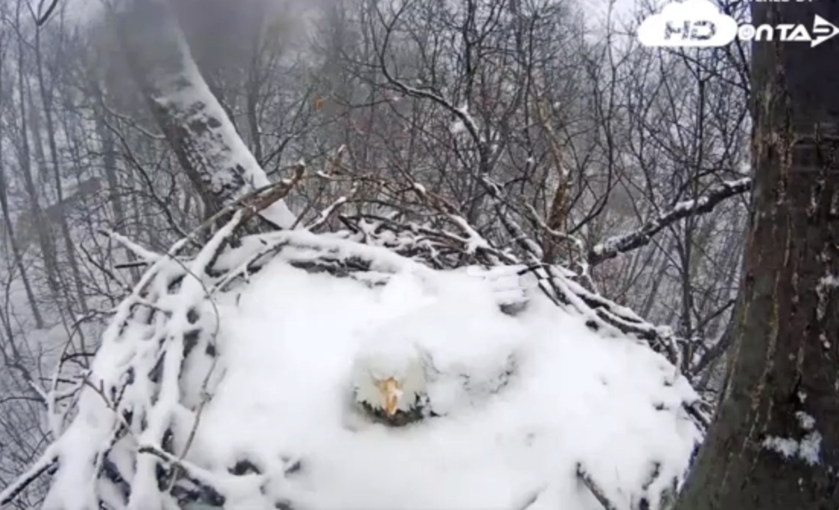 In 2018 the Hanover, Pennsylvania bald eagle cam documented eagles Liberty and Freedom allowing the snow to act as further insulation to their chicks. Photo: Pennsylvania Game Commission of Wildlife Cam