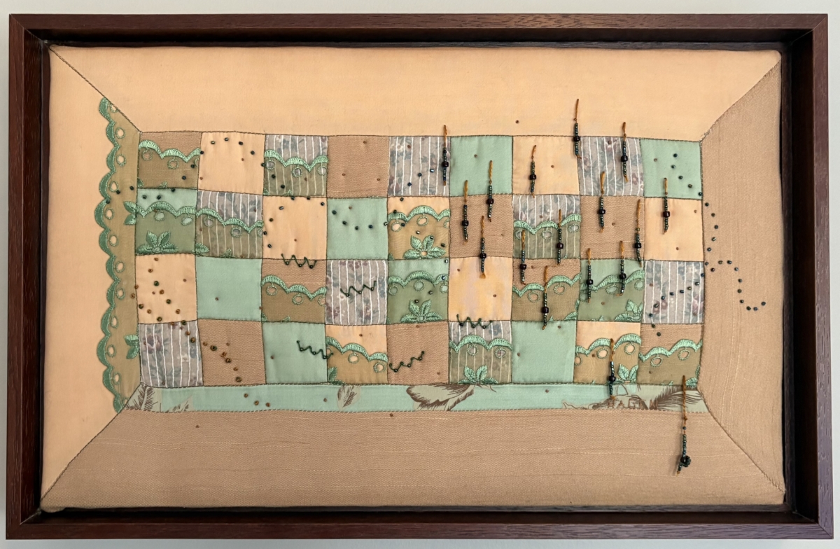 Associate Artist Alcove: Jen Vitale watercolor and ink works on wood, and Joyce Hagen’s abstract fiber arts and featured with other fiber art décor.
