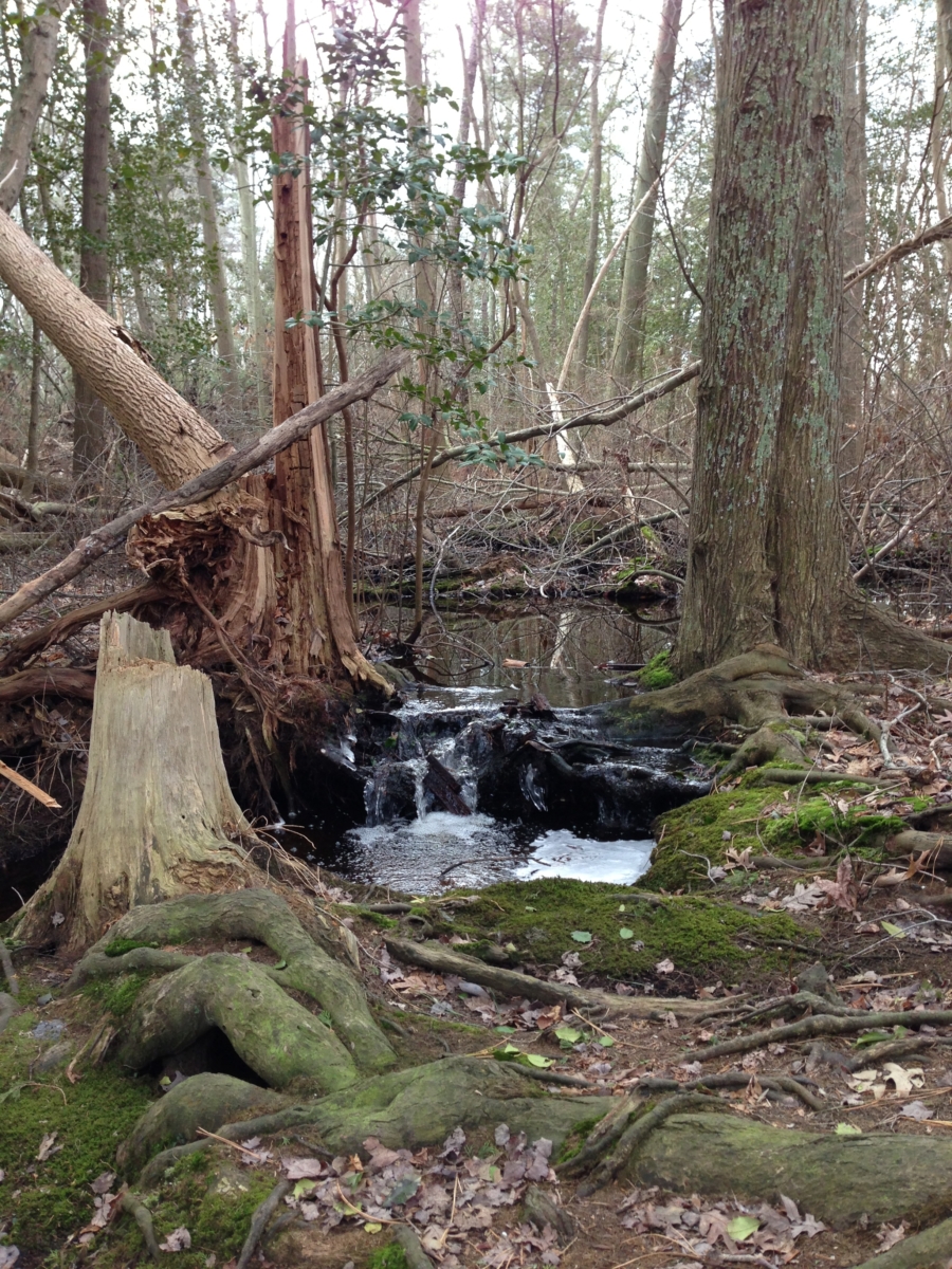 Signs of animals can be seen from greater distances in a winter woods, due to more open canopy and understory. Beaver activity at Union Lake Canal. RIGHT: In the stillness of a winter woods, a babbling brook like this one at the Natural Lands’ Peek Preserve can be heard from greater distances. Photos: J. Morton Galetto
