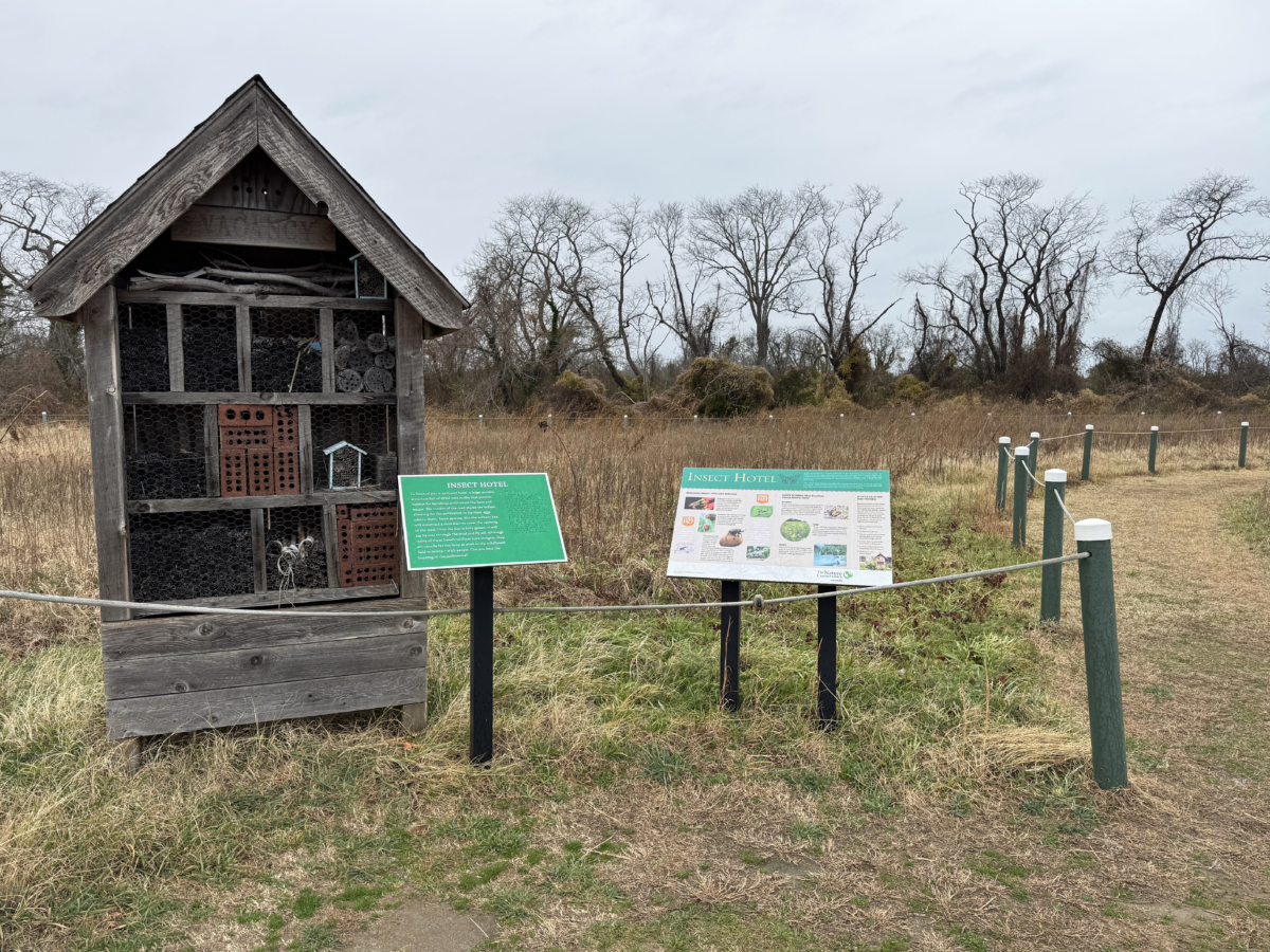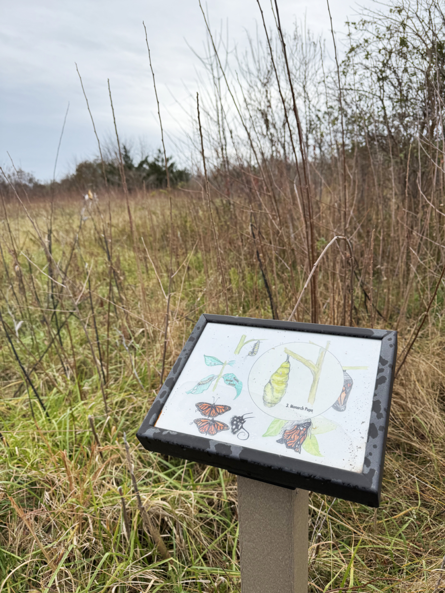 Braille trail and insect hotel at the Garrett Family Nature Conservancy Preserve. The rope allows visually impaired people to navigate a trail. Trailside signs illustrate the stages of a monarch’s development.