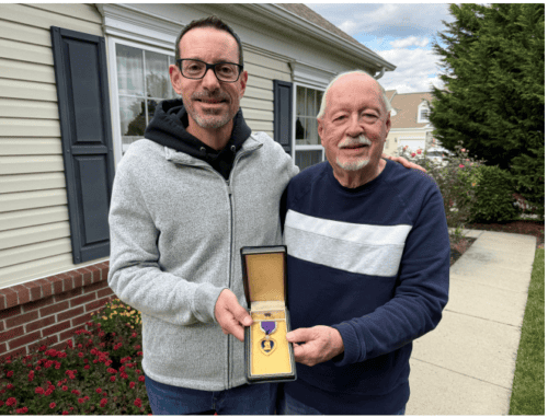 Lost World War II Purple Heart returned to soldier’s family. Nelson J. Nutt Jr. accompanied by his son Eric Nutt both of Hamilton Township, NJ, hold the Purple Heart medal