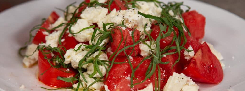 For a video of recipe prep for this salad, visit https://findjerseyfresh.com/JerseyFresh/recipes/heirloom-tomato-watermelon-feta-salad