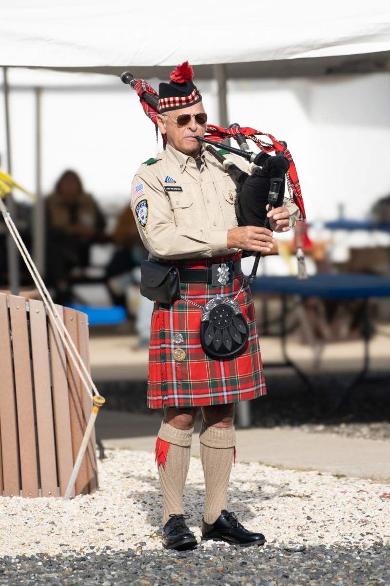 Displays on the museum grounds will include the Douglas C-47 Skytrain Nose, M603A Tank, a U.S. Navy A-4 Skyhawk, the U.S. Army C-23 Short Sherpa aircraft, the restored original Millville Air Base fire truck, a 1967 M151A1 Jeep, and a 2-1/2 ton military truck. Also, visitors can view four impressive outdoor murals created by the late mural artist Sam Donovan. They tell the history of the Millville Army Air Field during World War II. The tribute ceremony will include a presentation of the colors by Semper Marine Detachment 205 of Vineland, and a musical salute to veterans offered by bagpiper Jim Rembisz (pictured below). Prayers will be offered for veterans both alive and deceased. In commemoration, there will be a wreath laying and moment of silence.
