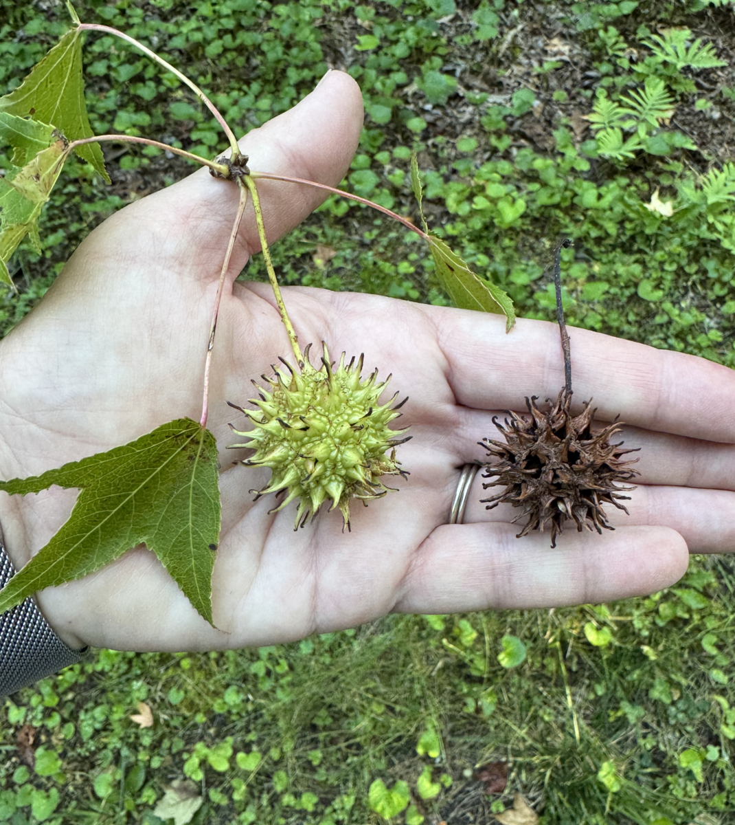 Setting aside the many uses and properties of sweetgum, we can simply enjoy its shade and splendor. And currently we are approaching the tree’s signature glory days of autumn. When the chlorophyll drains to the ground it reveals the leaves’ true colors of deep yellows, purples, fuchsias, and reds, dominating the forest scene in a rich display. Don’t miss the show!