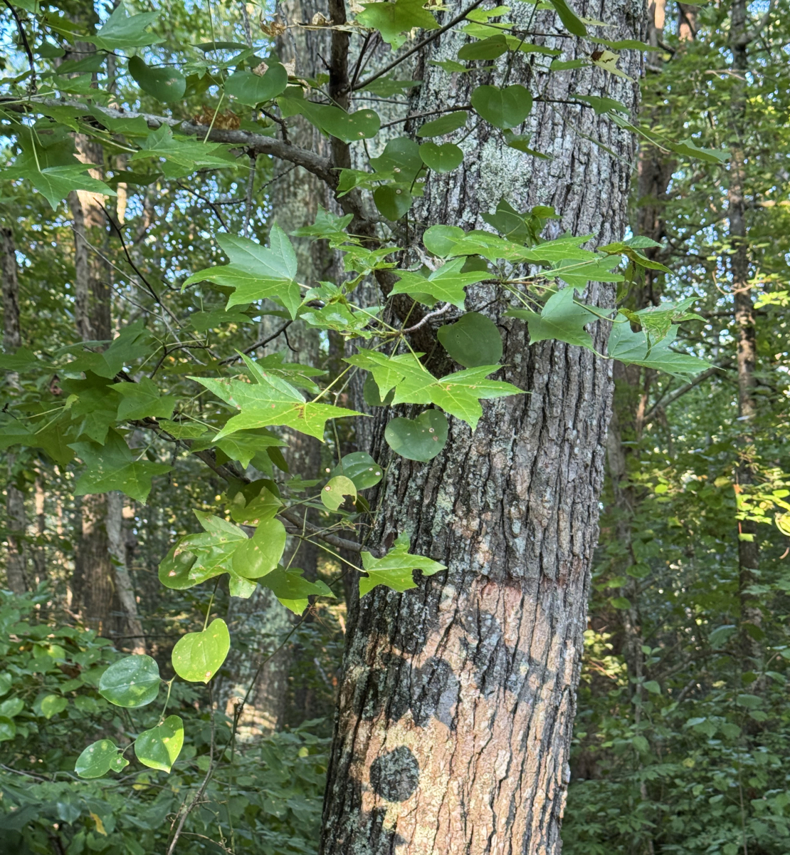 The bark of the sweetgum tree is brownish and deeply furrowed by narrow fissures. That’s greenbrier growing on the trunk. Typically, leaves have five pointed lobes.
