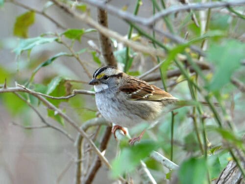 The white-throated sparrow’s most distinctive markings are the white patch beneath its bill and the two white wing bars. It is a passerine, a bird that has feet adapted for