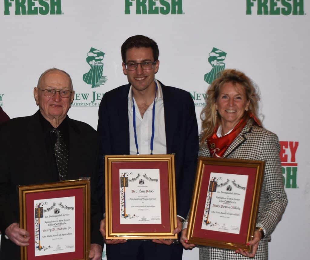 Mary Powers Nikola, right, and Henry D. DuBois Jr., were honored during the Award Presentations at the Joint State Agricultural Convention for their long-time service to New Jersey agriculture and the agriculture community. In center is Brandon Raso, named Outstanding Young Farmer.