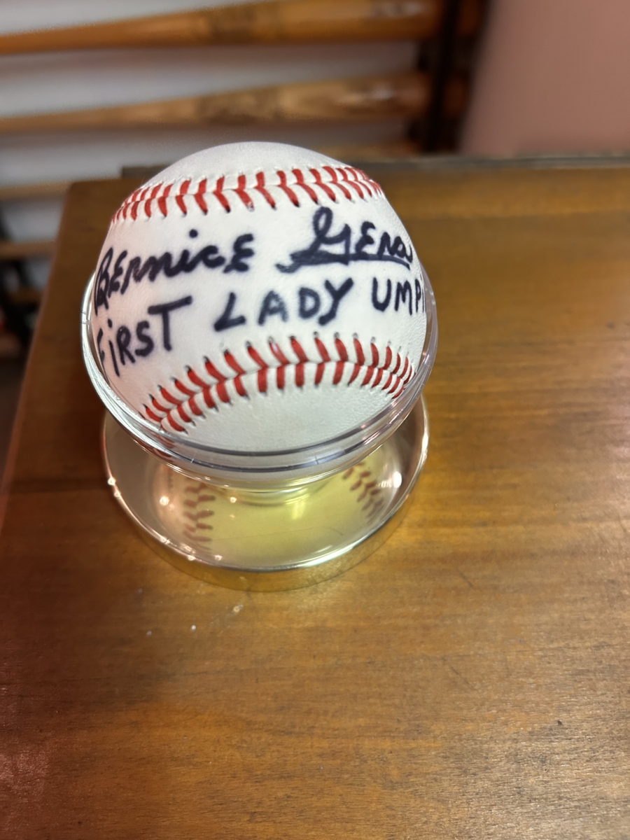 Official tournament baseball autographed by Bernice Gera, “First Lady Umpire.”