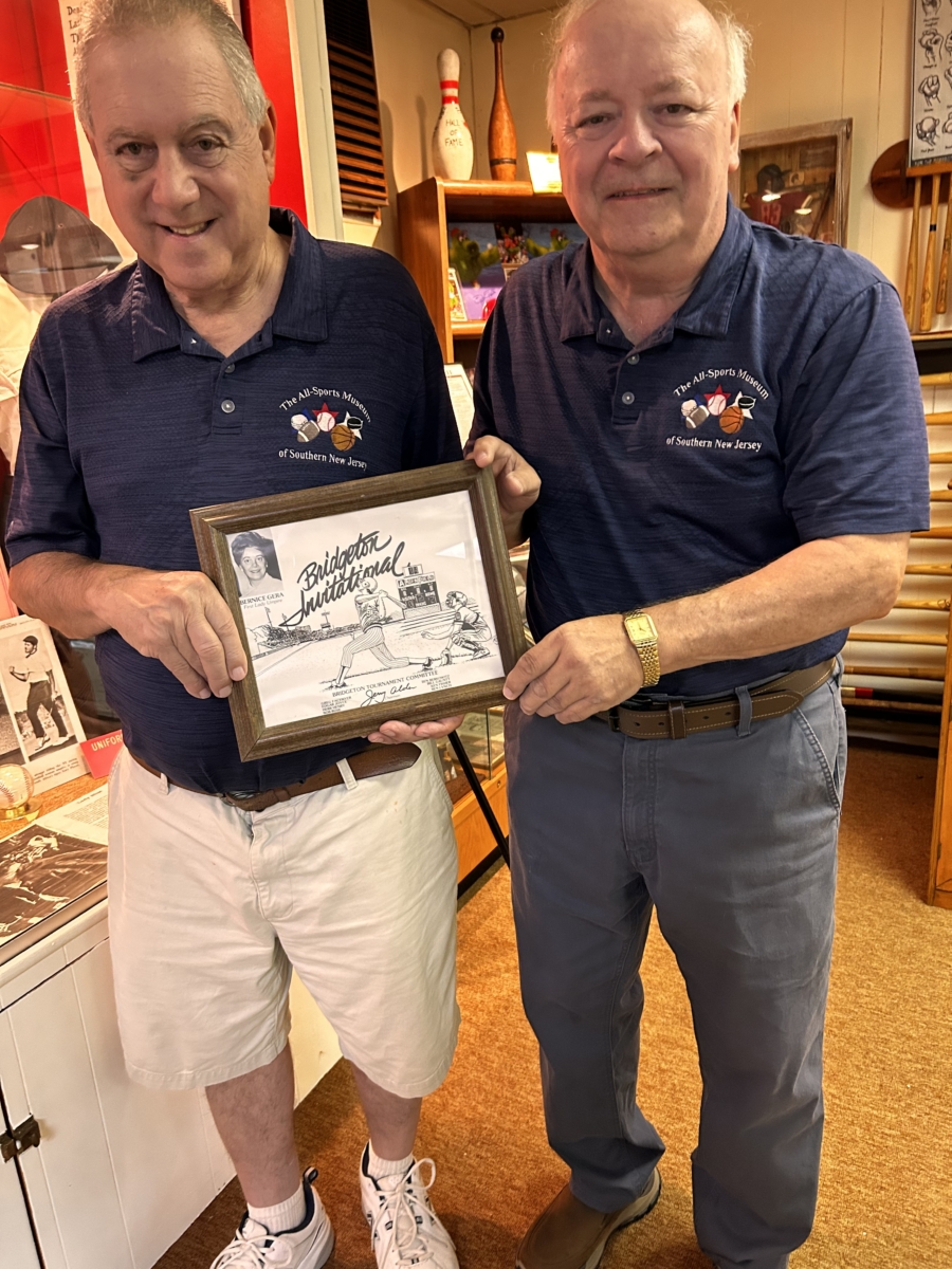 Dom Valella, left, chairman of The All-Sports Museum of Southern New Jersey, and Kevin Danna, treasurer, holding a program from the late 1960s for the Bridgeton Invitational, featuring a photo of Bernice Gera, who umpired the tournament regularly for several years.